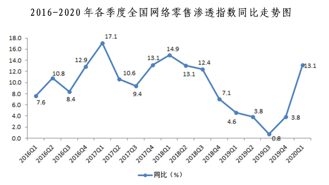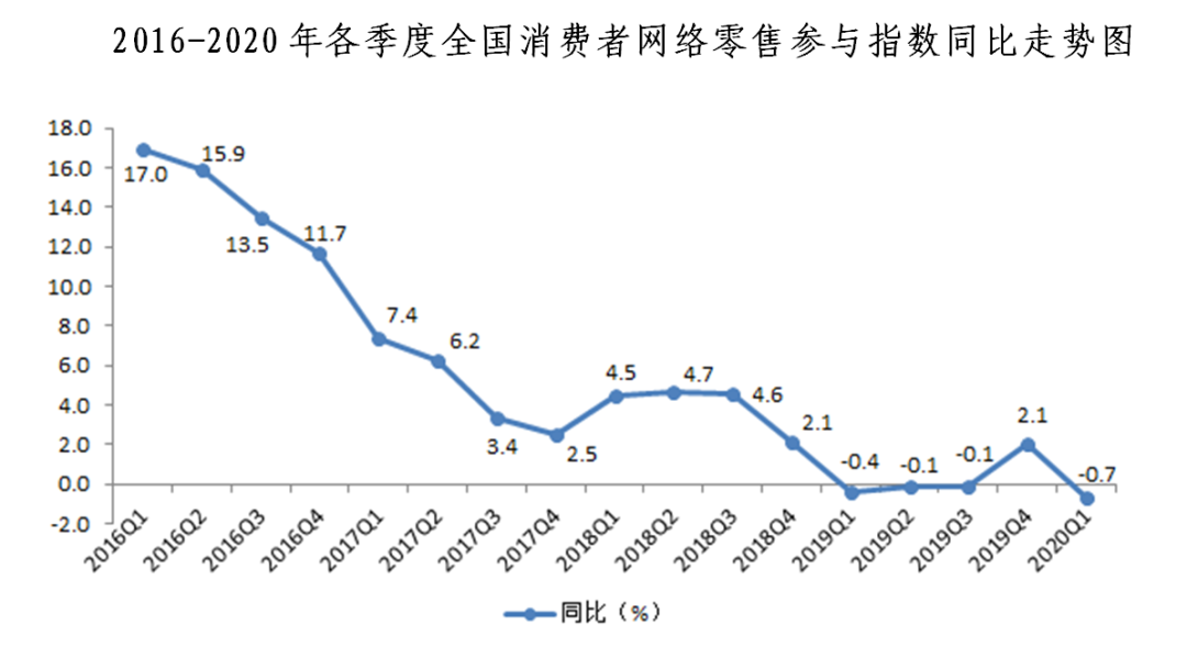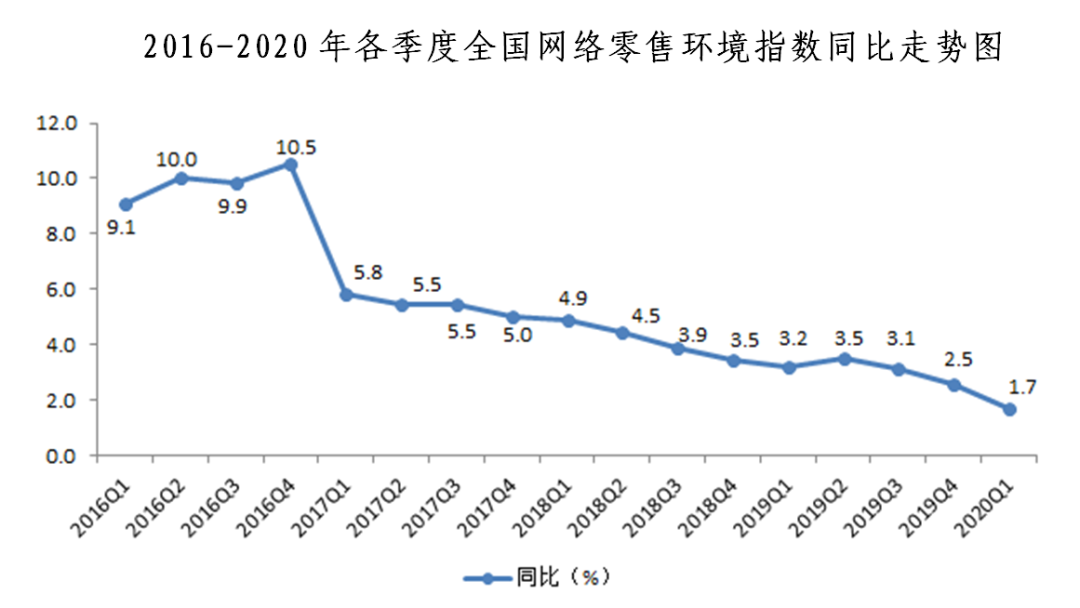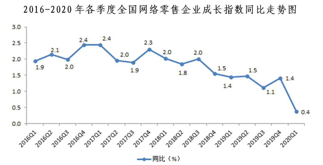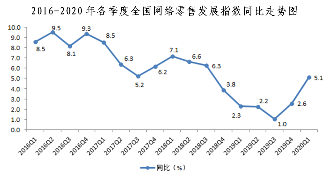 2020年一季度全國網(wǎng)絡(luò)零售發(fā)展指數(shù)同比增長5.1%
